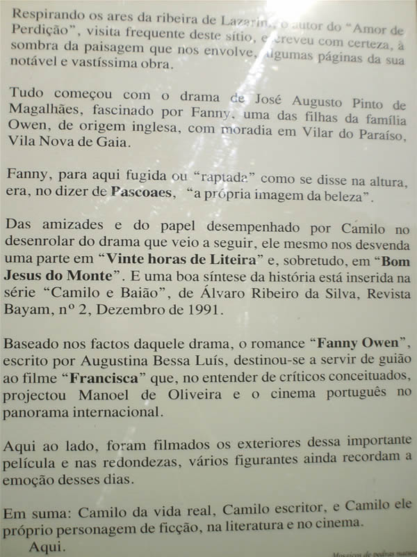 Perto da Casa Museu de Eça, na Ribeira de Lazarim, tiveram lugar as filmagens exteriores do Filme "Francisca" de Manoel de Oliveira, em que o romance "Fanny Owen" de Agustina Bessa Luís serviu de guião, inspirado na obra de Camilo Castelo Branco, "Vinte Horas de Liteira", autor do celebre livro"Amor de Perdição".